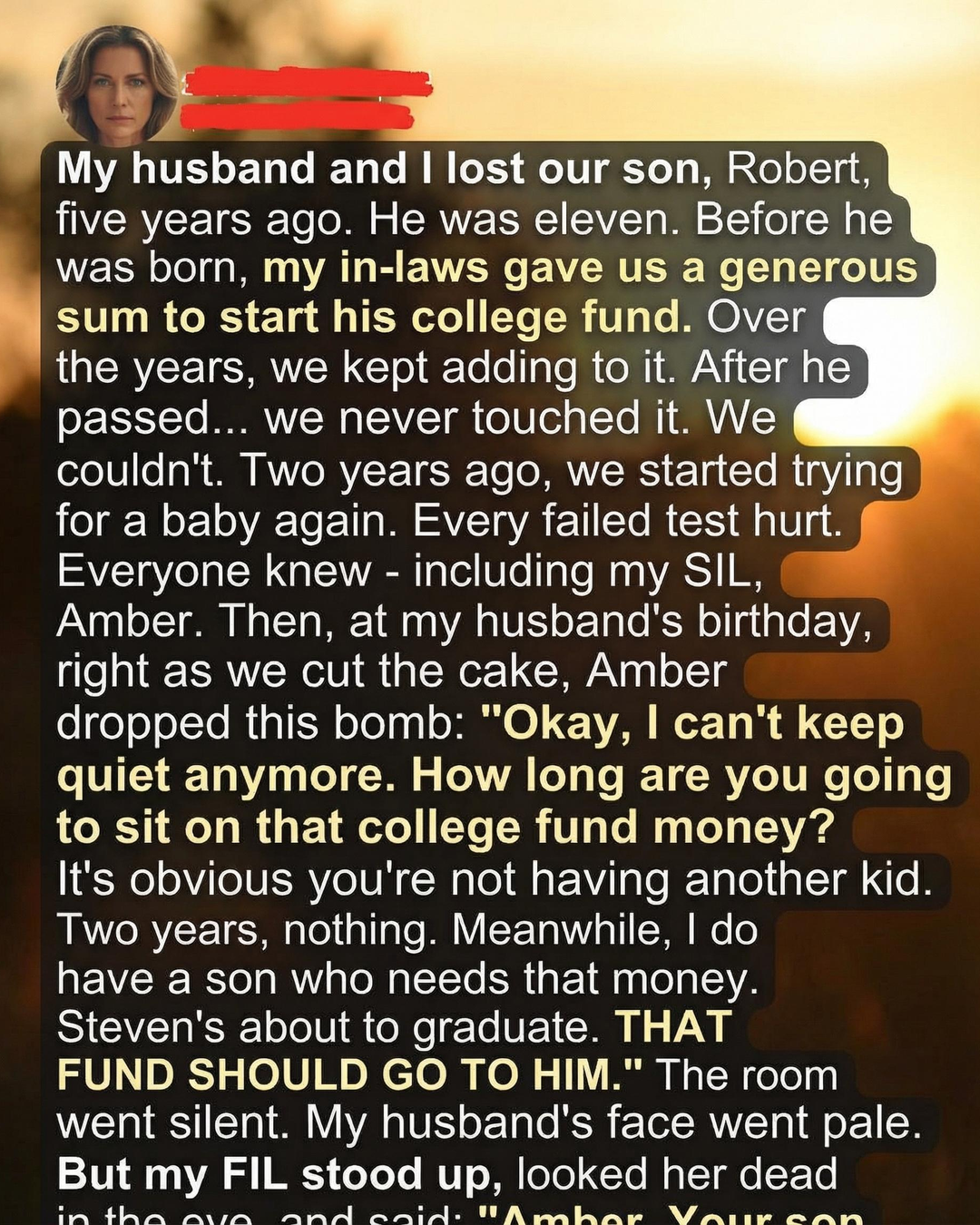 My husband and I lost our son, Robert, five years ago. He was eleven. Before he was born, my in-laws gave us a generous sum to start his college fund. Over the years, we kept adding to it. After he passed… we never touched it. We couldn’t. Two years ago, we started trying for a baby again. Every failed test hurt. Everyone knew — including my SIL, Amber. Then, at my husband’s birthday, right as we cut the cake, Amber dropped this bomb: “Okay, I can’t keep quiet anymore. How long are you going to sit on that college fund money?” Her words hung in the air, sharp and unexpected. I felt the weight of every eye in the room shift toward us, and a heaviness settled on my chest. Amber continued, her tone firm, insisting that since we had not been able to grow our family again, the fund should “at least go to someone who could use it.” She argued that her son, Steven, was preparing for college and that the money would be better spent than “sitting untouched in a savings account for a child who would never use it.” I saw my husband’s expression fall, as though someone had reached inside him and reopened every wound he had tried so hard to heal.