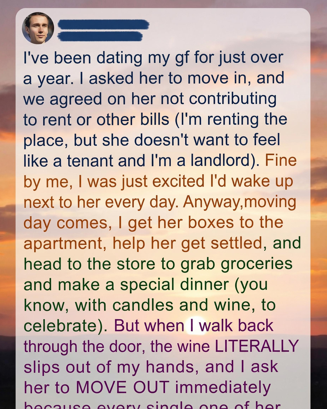 I’ve been dating my girlfriend for just over a year. I asked her to move in, and we agreed on her not contributing to rent or other bills (I’m renting the place, but she didn’t want to feel like a tenant and I didn’t want to feel like a landlord). Fine by me—I was simply excited to wake up next to her every day. Moving day comes, I get her boxes into the apartment, help her settle in, and head to the store to grab groceries so I can prepare a special dinner—candles, music, the whole thing. But when I walk back through the door, the wine literally slips out of my hands, and I ask her to move out immediately because every single one of her boxes is completely empty. Instead of unpacking her belongings, she had used the time to rearrange the entire apartment, replacing my furniture, my decorations, and even the layout I had lived with for years.