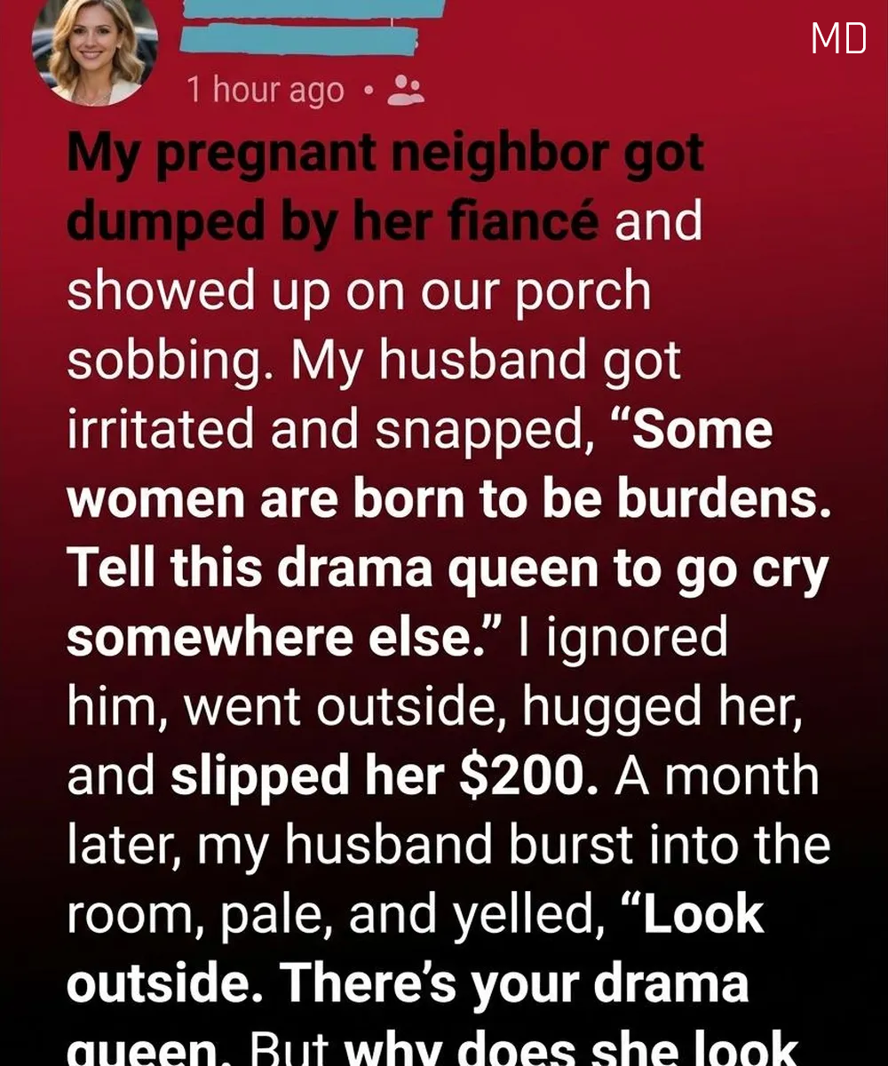 The evening was quiet until a soft knock broke the calm. When I opened the door, I found my neighbor standing there, her eyes red from crying and her hands trembling as she held onto the railing for support. She explained through tears that her fiancé had left her, and with nowhere else to go, she had come to the only place that felt safe. I didn’t hesitate. I stepped outside, wrapped her in a warm embrace, and brought her in. Behind me, I heard my husband’s disapproving sigh, but in that moment, compassion felt more important than comfort.