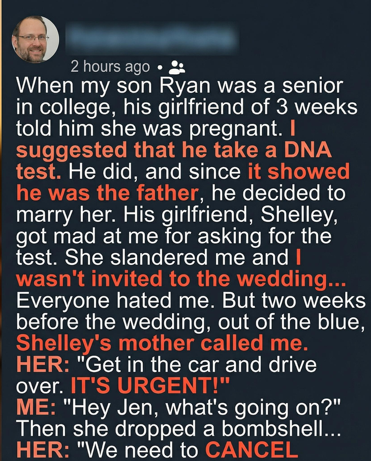 When my son Ryan was a senior in college, his girlfriend of 3 weeks told him she was pregnant. I suggested that he take a DNA test. He did, and since it showed he was the father, he decided to marry her. His girlfriend, Shelley, got mad at me for asking for the test. She said I was questioning her honesty, and soon after, I became the villain in everyone’s story. What hurt most wasn’t the tension—it was that I wasn’t invited to the wedding. Watching Ryan try to build a future under pressure made me worry not just as a parent, but as someone who had watched him grow into a thoughtful, responsible young man. I hoped he understood that my hesitation came from concern, not doubt.