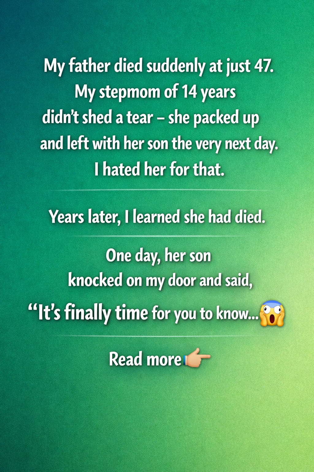 My father died suddenly at just forty-seven, and the shock of it split my life in two. Grief settled into the walls of the house like dust, heavy and unavoidable. What hurt almost as much as losing him was watching my stepmother—who had been part of our lives for fourteen years—pack her things the very next day. She didn’t cry in front of me. She moved quietly, efficiently, taking her teenage son with her, leaving behind rooms that still smelled like my father. I told myself her silence meant she never truly loved him, and that belief hardened into resentment I carried for years.