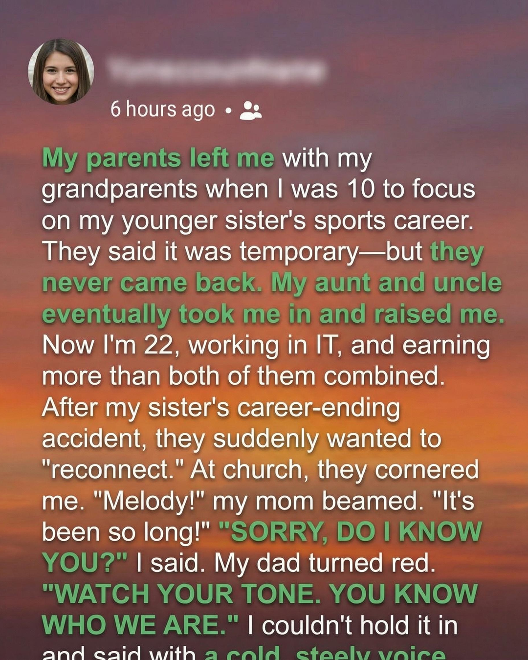 But life has a way of circling back. After my sister’s sudden, career-ending accident, my parents began reaching out through distant relatives, trying to “reconnect.” At first, I ignored them, assuming it was just guilt whispering too late in their ears. Then, one Sunday morning at church, they approached me with smiles far too warm for strangers. “Melody!” my mother exclaimed as if my childhood hadn’t been shaped by her absence. “It’s been so long!” My father stood stiffly beside her, nodding like he expected me to fall into their arms out of gratitude instead of bewilderment. “Sorry, do I know you?” I replied, letting the words sit heavy in the space between us. My father’s expression soured instantly, as though I had insulted him merely by reflecting the truth.