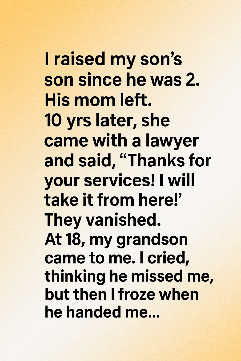 I raised my son’s son since he was 2. His mom left. 10 yrs later, she came with a lawyer and said, “Thanks for your services! I will take it from here!” They vanished. At 18, my grandson came to me. I cried, thinking he missed me, but then I froze when he handed me a small, worn envelope with my name written on it in handwriting I recognized immediately—his. My hands shook as I held it, not because I feared what it contained, but because after more than a decade without hearing his voice, simply seeing him standing there felt like a miracle in itself. Those twelve years without him were some of the longest of my life. I had raised him through scraped knees, bedtime stories, school projects, and all the little moments that make a childhood whole. When his mother unexpectedly returned and took him under her wing again, it felt like someone had quietly removed the sun from my sky.