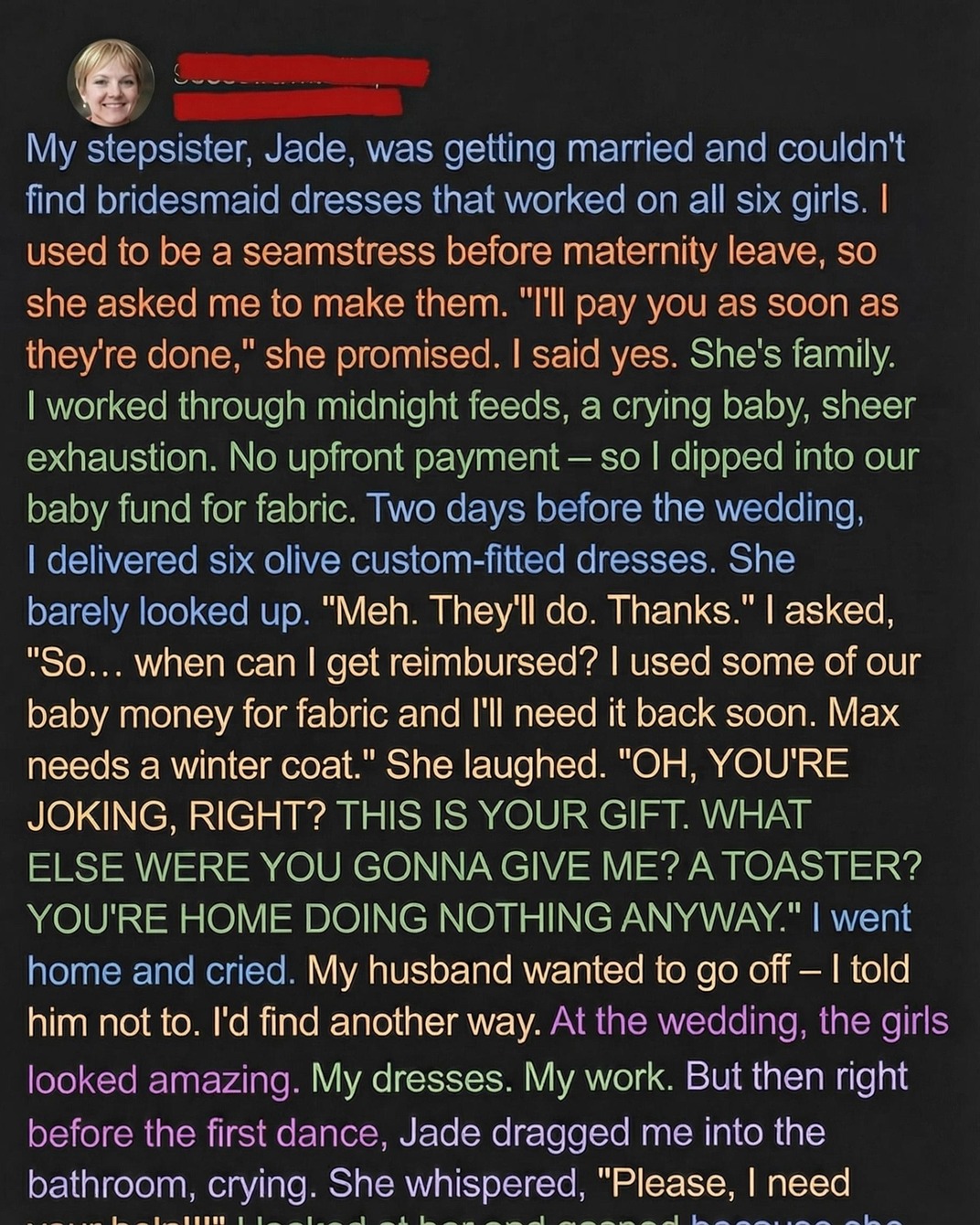 When my stepsister Jade called to ask if I could sew six custom bridesmaid dresses for her upcoming wedding, I hesitated but agreed, hoping the project might bring us closer. With a newborn at home and our savings stretched thin, the extra income would have helped. Still, I used $400 from our baby fund to purchase fabric, lining, and all the materials needed. Over the next three weeks, I cared for my son in between fittings, adjusted designs to suit each bridesmaid’s needs, and worked late into the night. By the time the dresses were finished, they looked like they belonged in a professional showroom. When I delivered them, however, Jade brushed off my effort and insisted the dresses were simply my “gift,” despite promising to pay for both materials and labor. Her casual dismissal left me feeling unappreciated and deeply disappointed.