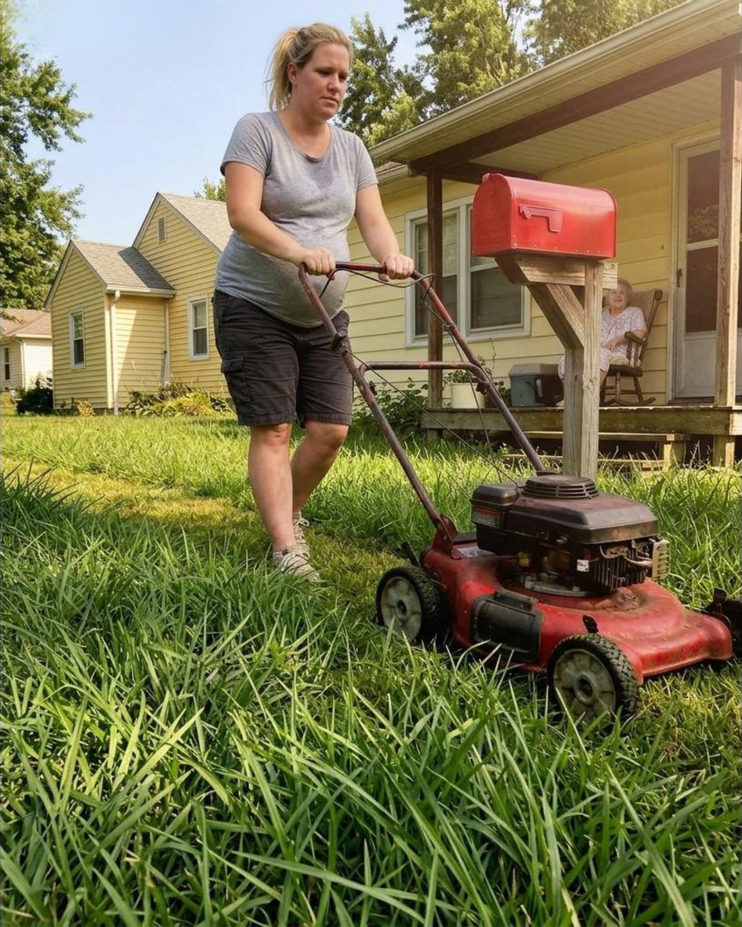 I thought my life had reached its lowest point when I was 34 weeks pregnant, alone, and told my home was entering foreclosure. My partner had left the moment I chose to keep our baby, and the bills on my kitchen counter felt heavier each day. That afternoon, after the devastating call from the bank, I stepped outside trying to catch my breath and found my 82-year-old neighbor, Mrs. Higgins, struggling to push a lawn mower beneath the blazing summer sun. Though exhausted and overwhelmed myself, I couldn’t walk away. I offered to help, and despite my swollen feet and aching back, I finished mowing her entire lawn while she watched from the porch with grateful eyes.