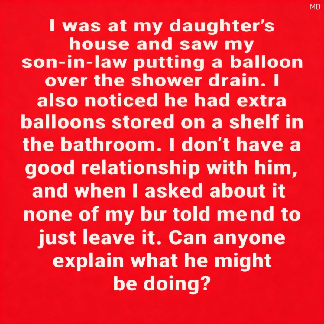 When I visited my daughter one weekend, I expected nothing more than a quiet afternoon together. Her home was warm and welcoming, filled with the familiar sounds of daily life. While she prepared coffee in the kitchen, I walked down the hallway and stepped into the bathroom to wash my hands. That was when I noticed something unusual. My son-in-law was kneeling near the shower, carefully stretching a balloon over the drain. At first, I thought it might be a joke or some kind of strange decoration. But when I looked closer, I saw several more balloons neatly stored on a small shelf nearby.