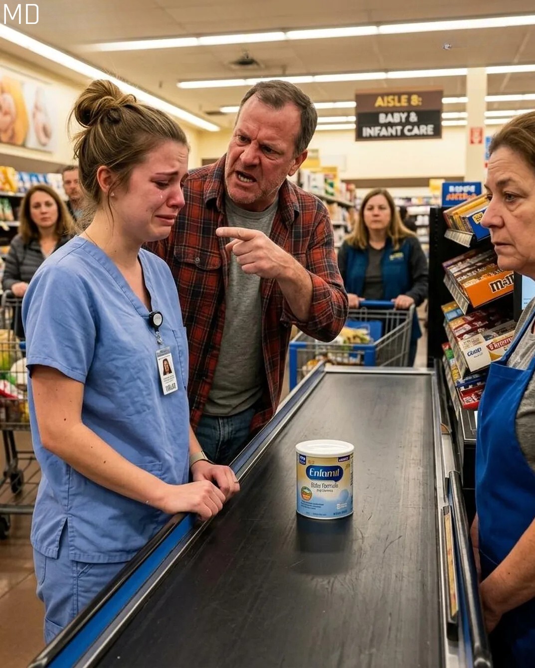 I went to the grocery store for a quick errand, expecting nothing more than to grab a pack of lightbulbs. But at the checkout, my day took an unexpected turn. Ahead of me, a young nurse in wrinkled scrubs struggled to pay for a can of hypoallergenic baby formula. When her card was declined, a man behind me sneered, “If you can’t afford a baby, maybe don’t have one.” The words were cruel, echoing through the store, and the young woman froze, tears welling in her eyes. The tension in the air was heavy, and everyone seemed unsure of how to react. That was the moment I knew I had to step in.