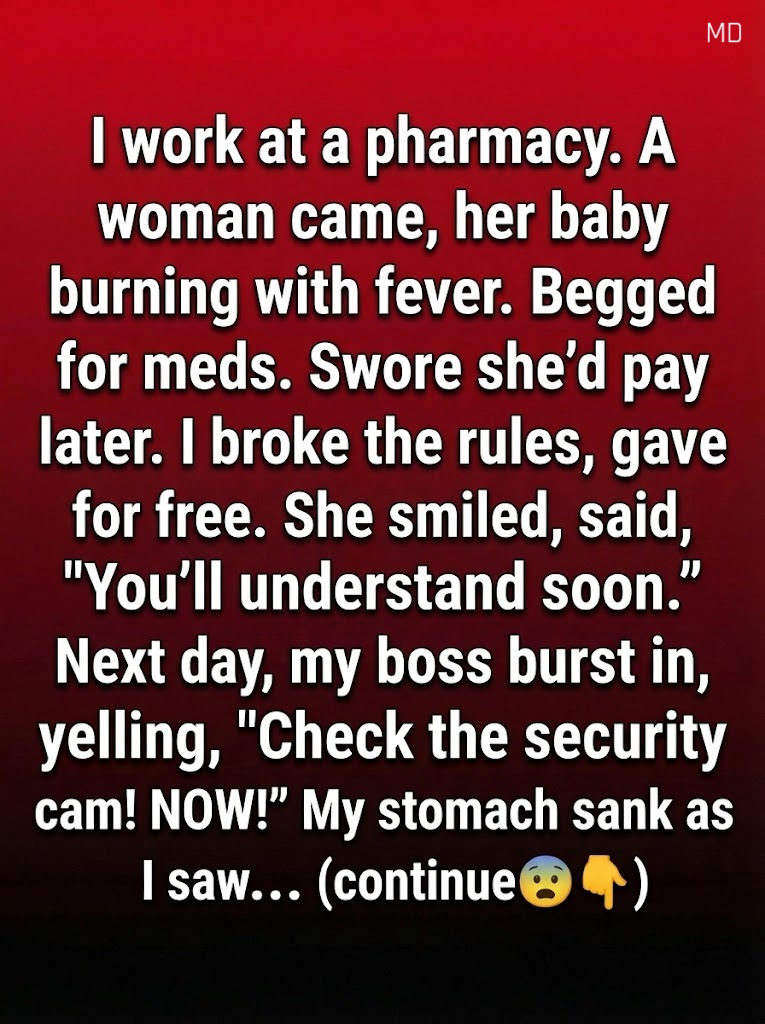 I work the evening shift at a small neighborhood pharmacy, the kind where people come not just for medicine, but for reassurance. One quiet night, just before closing, a woman rushed in holding a baby wrapped tightly in a blanket. The child’s face was flushed, and even from a distance I could tell the fever was high. Her voice trembled as she asked for help, explaining she didn’t have money with her but would return the next day to pay. I hesitated, knowing the rules were strict about dispensing medication without payment. But something in her eyes—fear mixed with hope—made the decision for me. I gave her what she needed. As she turned to leave, she paused, smiled gently, and said, “You’ll understand soon.”