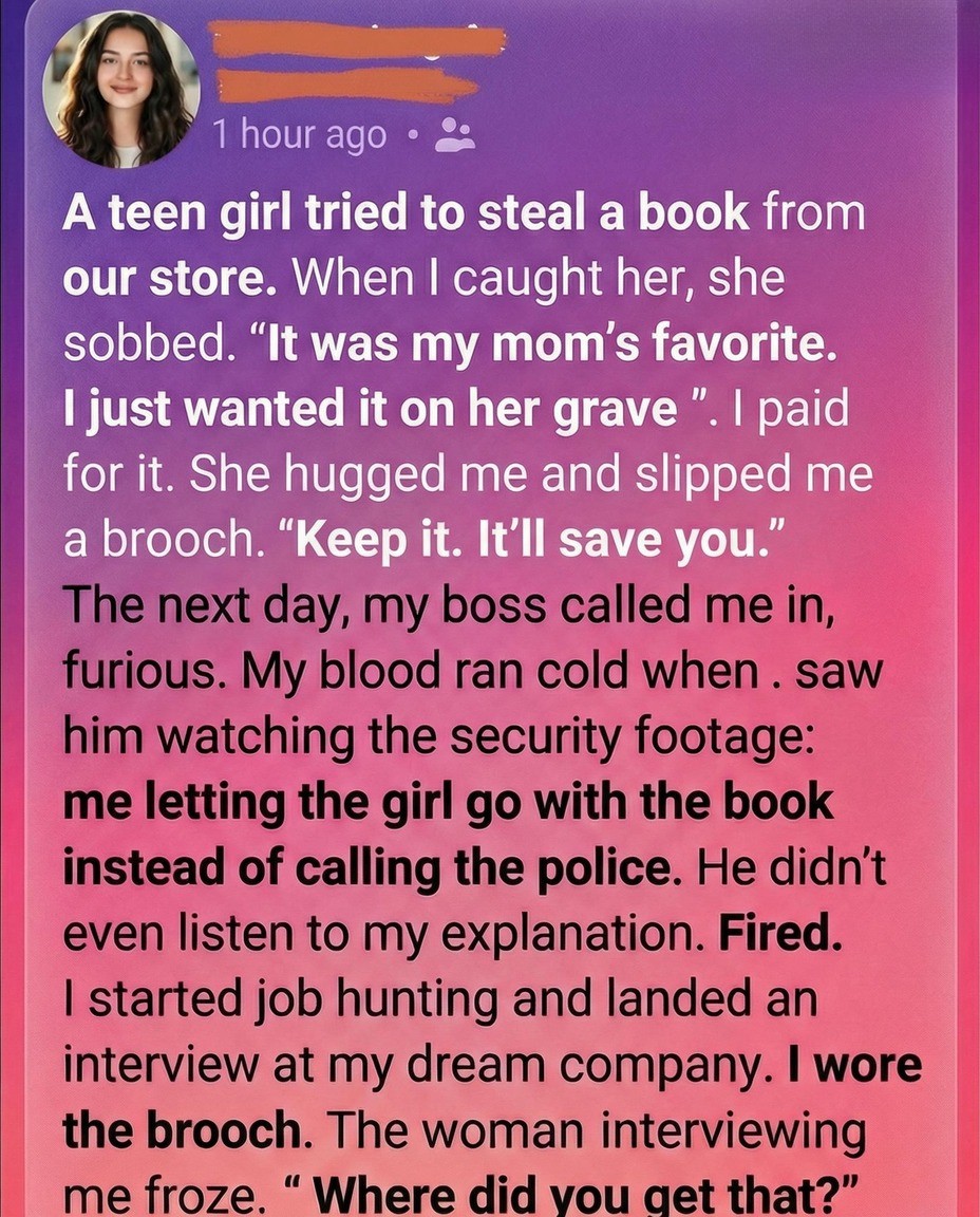 The next morning, my manager reviewed security footage and questioned my actions. Despite my explanation, he focused only on policy and decided to let me go. I left the bookstore carrying my belongings and the small silver brooch in my pocket, unsure of what came next. A week later, I wore the brooch to a job interview at an architectural firm, hoping to start over. Midway through the conversation, the hiring manager noticed it and asked about its origin. When I told her the story, she led me to meet the firm’s owner. The moment he saw the brooch, he grew quiet. He explained it had belonged to his late wife and that his daughter had disappeared with it after a painful family loss. That unexpected connection opened doors none of us had anticipated. What began as a small act of compassion in a quiet bookstore ended up guiding me toward a new career and helping a family rediscover a missing link. Sometimes, kindness finds a way to return in ways we could never plan.