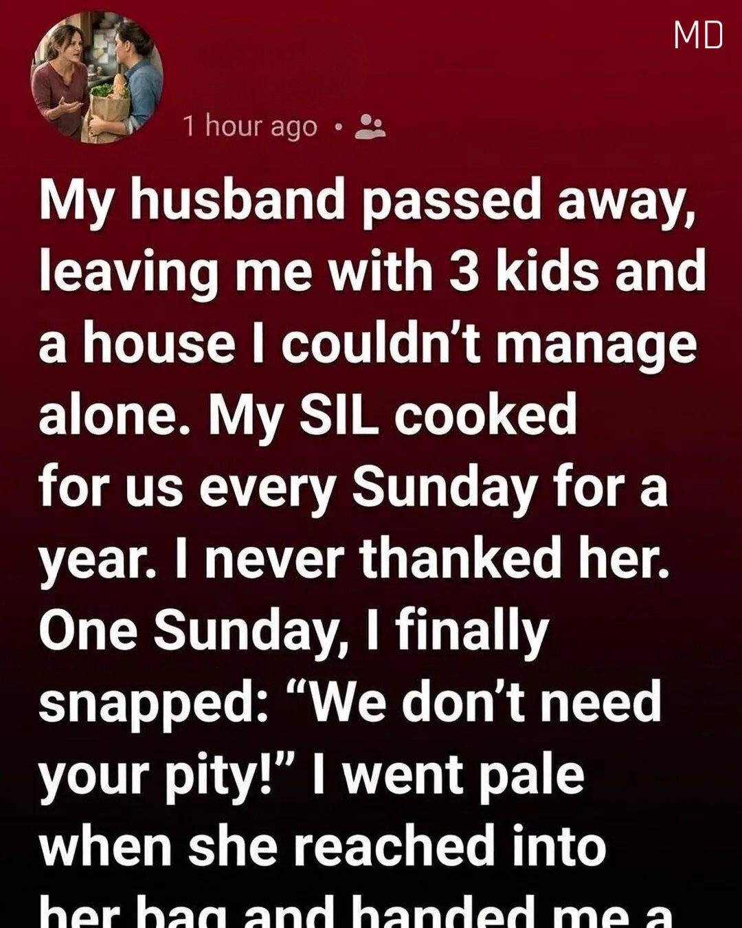The year after my husband passed away felt like walking through a life that no longer fit. Every room in the house echoed with absence, every responsibility heavier than it used to be. Three children looked to me for stability I wasn’t sure I had, and a home I once shared now felt far too large to carry alone. In the middle of all that quiet struggle, my sister-in-law showed up every Sunday without fail—arms full of groceries, meals prepared, and a calm presence I never asked for but always accepted.