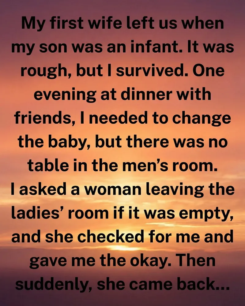 My first wife left us when my son was an infant. It was rough, but I survived. One evening at dinner with friends, I needed to change the baby, but there was no table in the men’s room. I asked a woman leaving the ladies’ room if it was empty, and she checked for me and gave me the okay. Then suddenly, she came back… She tapped gently on the door and asked, “Do you need help?” Her voice sounded kind, not intrusive, and when I stepped out, she smiled in a way that made the chaos of single fatherhood feel a little less heavy. I thanked her and told her I had things under control, but she lingered for a moment, just long enough to say, “You’re doing great. Don’t let anyone tell you otherwise.” I nodded, unsure why her comment felt so comforting, but somehow it did. That night, as I drove home with my son asleep in the back seat, I kept thinking about how a stranger’s small gesture had softened a day that had felt endlessly hard.