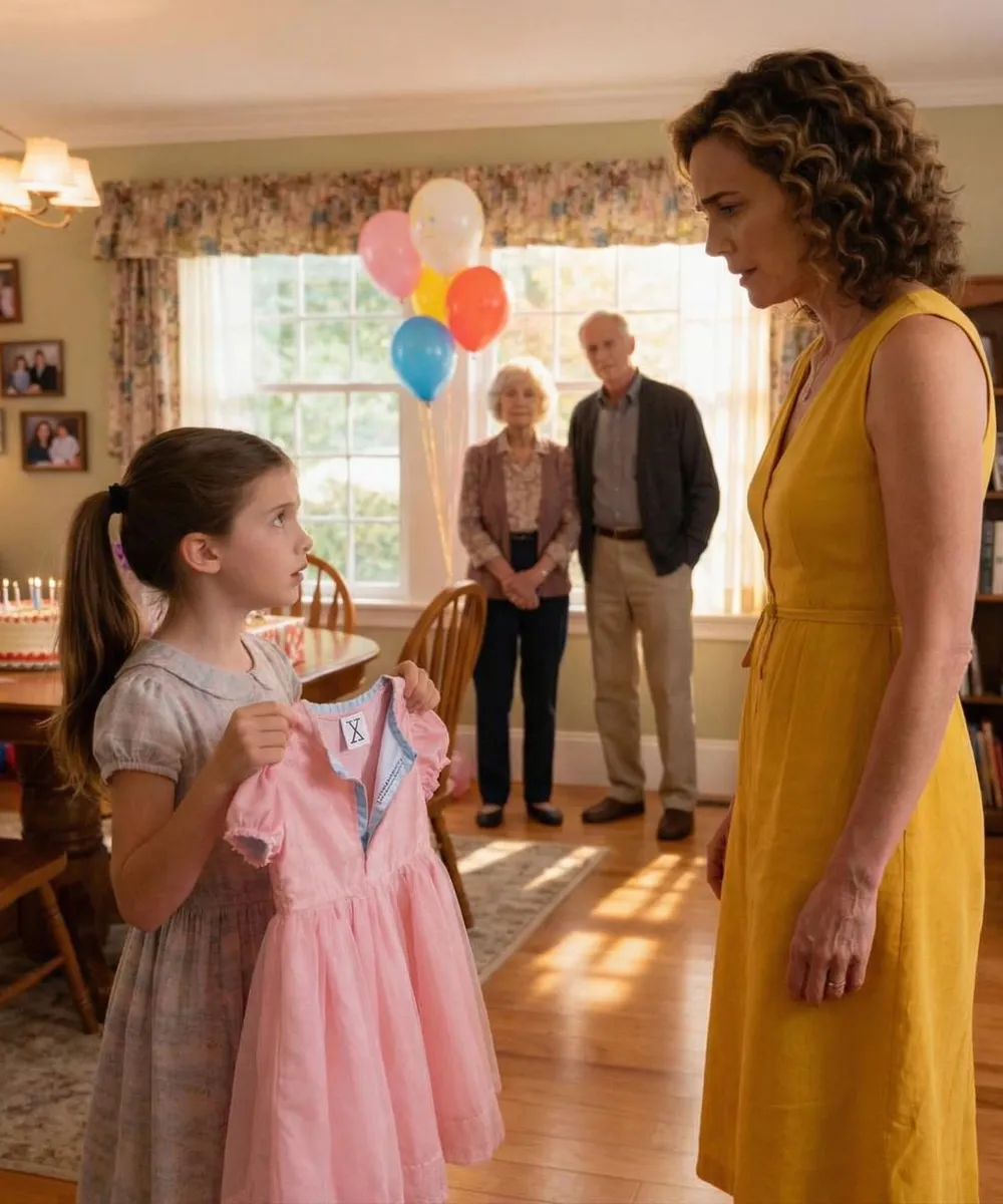 On my daughter Emma’s eighth birthday, I wanted nothing more than a joyful, simple day. The kitchen was filled with balloons, heart-shaped pancakes, and her laughter as she wore a paper crown like a tiny queen. My parents arrived with polished smiles and a carefully wrapped gift: a pink dress covered in soft tulle and tiny sequins. Emma’s eyes sparkled as she lifted it from the bag and hugged it to her chest. But her excitement shifted in an instant. She stopped moving, her fingers pressing into the lining. “Mom,” she whispered, “what’s this?” I took the dress gently from her, forcing calm into my voice while my heart began to race.