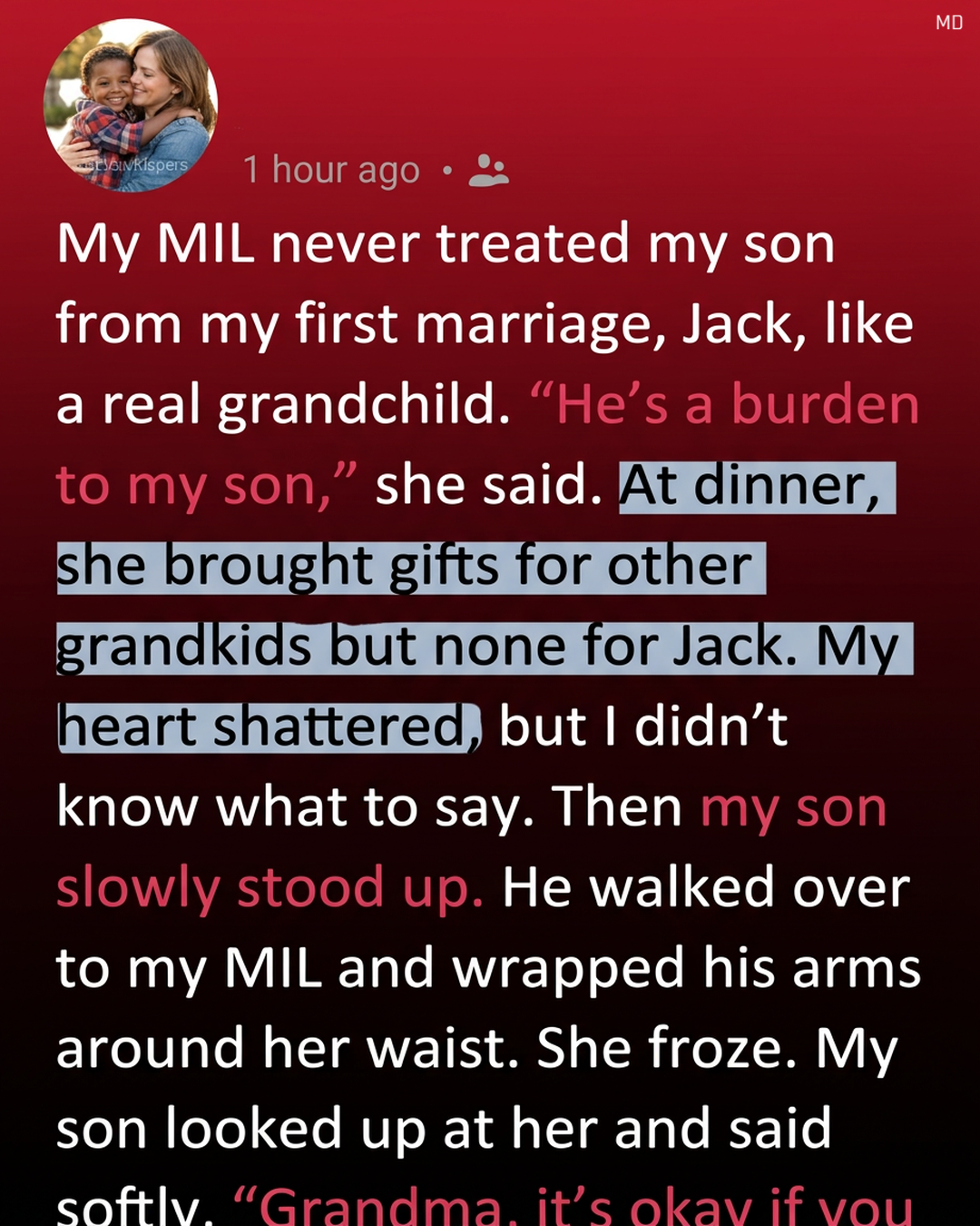 The first time I noticed the difference was during a family dinner that should have felt warm and joyful. My mother-in-law had arrived with small gift bags for the other grandchildren, each carefully wrapped and placed beside their plates. My son, Jack, sat quietly at the table, smiling politely as he watched his cousins open their presents. When the last gift was handed out, there was nothing left for him. I felt my chest tighten, unsure how to explain the moment to a child who had done nothing wrong. My mother-in-law had never fully accepted him because he was from my first marriage, and although I tried to ignore the tension for the sake of peace, that evening made it impossible to pretend everything was fine.