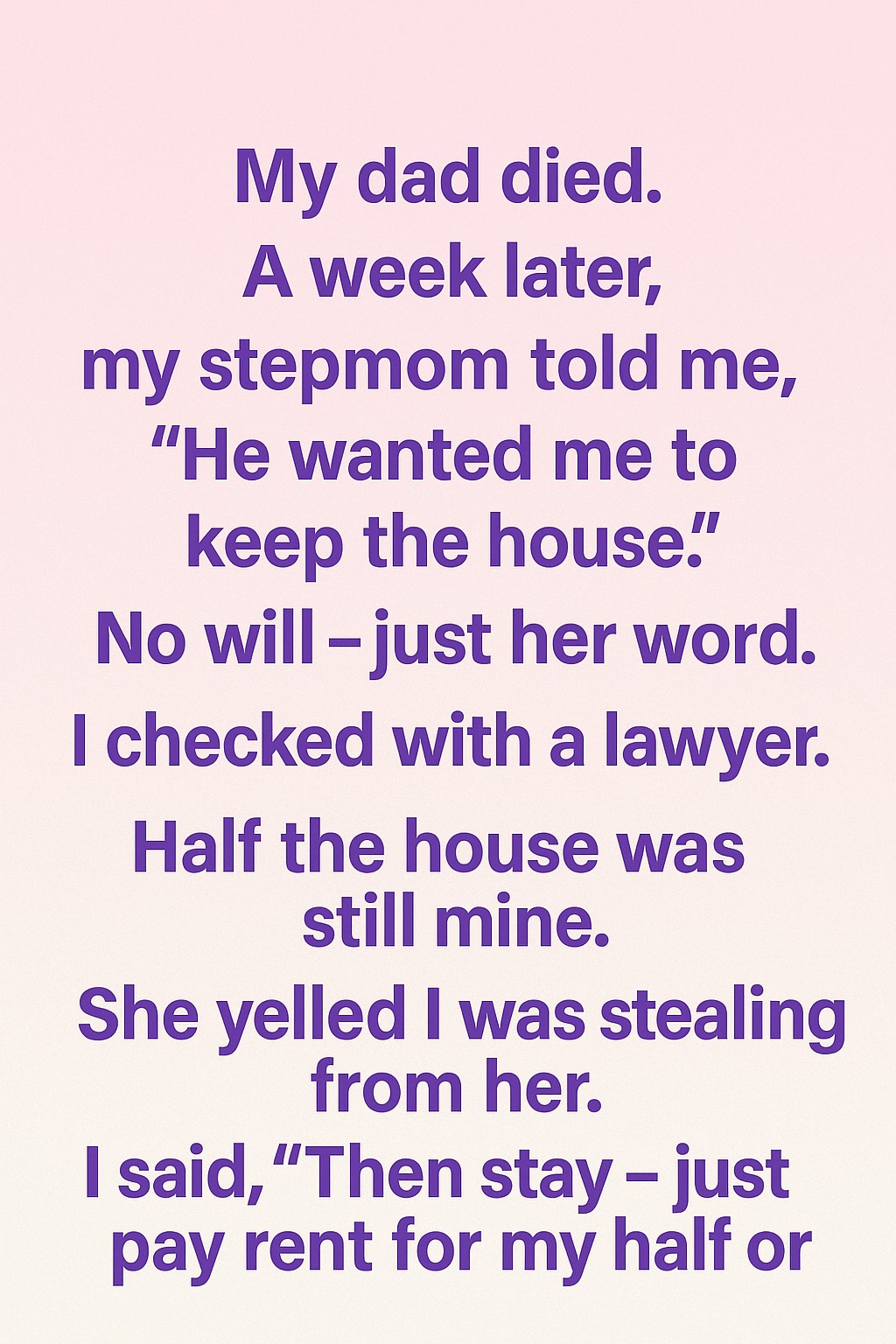 She said I was taking something from her.I replied, “Then stay—just pay rent for my half or…”After that conversation, the atmosphere in the house shifted. I was still getting used to life without my father, and the discussion about the home added another layer of uncertainty. I never wanted any disagreements; I simply wanted everything handled fairly, especially regarding something he had cared for deeply. To me, the house wasn’t just a property—it was the place where many meaningful moments lived. For my stepmom, it was her comfort and sense of stability. We were both holding on to the same place, but for different emotional reasons.