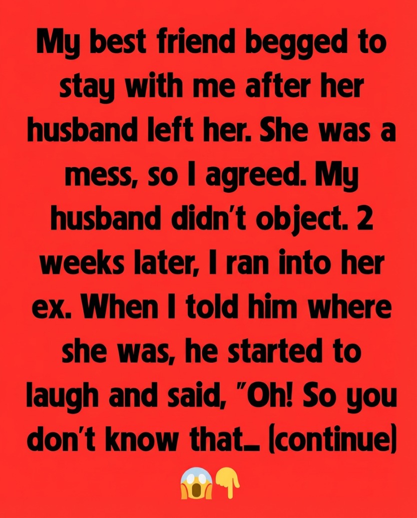 My best friend begged to stay with me after her husband left her. She was a mess, so I agreed. My husband didn’t object. Two weeks later, I ran into her ex. When I told him where she was, he started to laugh and said, “Oh! So you don’t know that—” He stopped himself abruptly, and the uncertainty in his eyes unsettled me more than anything he could’ve said aloud. I pressed him gently, but he shook his head, muttered something about “needing to explain things properly,” and walked away with the promise of calling me later. That night, as my friend sat on my couch wrapped in a blanket and sipping tea, I couldn’t shake the feeling that there was something I wasn’t being told. She seemed calmer than she had been when she first arrived, but there was also a strange heaviness behind her smiles, like she was trying to hold something together that was still breaking.